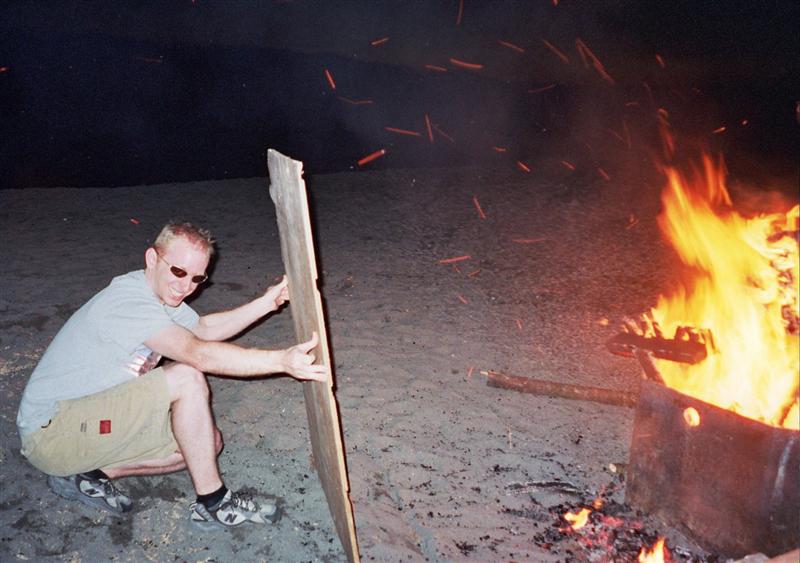 Trent volunteered to be the man of action and happily began slicing through the pile of wood. Had quite the audience in fact - it's hard to ignore a chainsaw weilding madman on a beach - and eventually drew the eye of a man fastooned with cameras and flashbulbs. Turns out Sunset magazine is doing a piece on beach bonfires and we were "the most mechanized group" he'd seen. So here's hoping trent gets some national publicity.